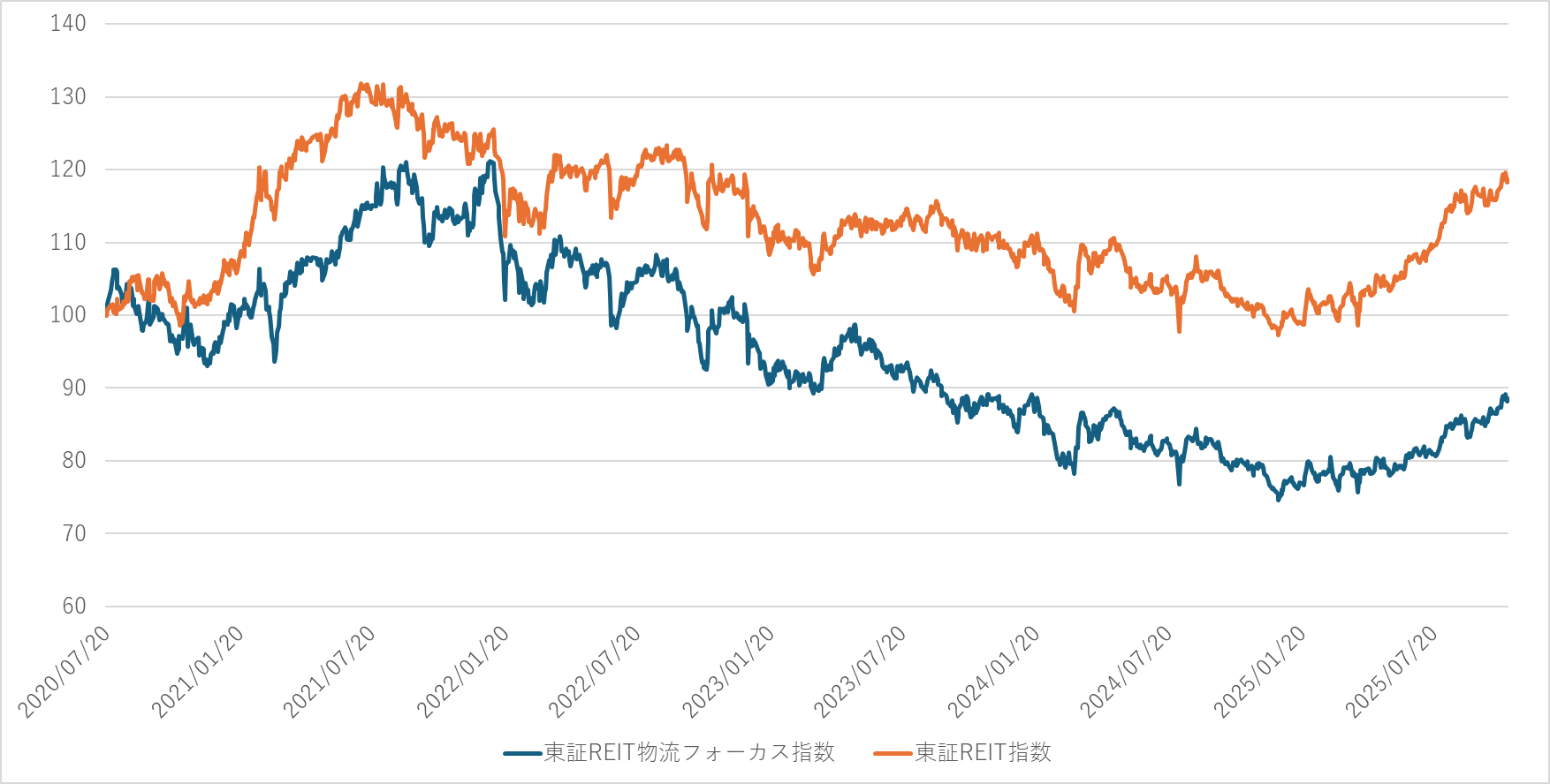 東証REIT物流フォーカス指数と東証REIT指数のチャート比較