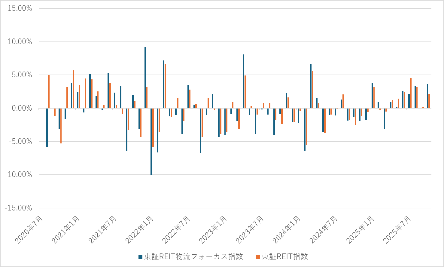 東証REIT物流フォーカス指数と東証REIT指数の月次パフォーマンス比較